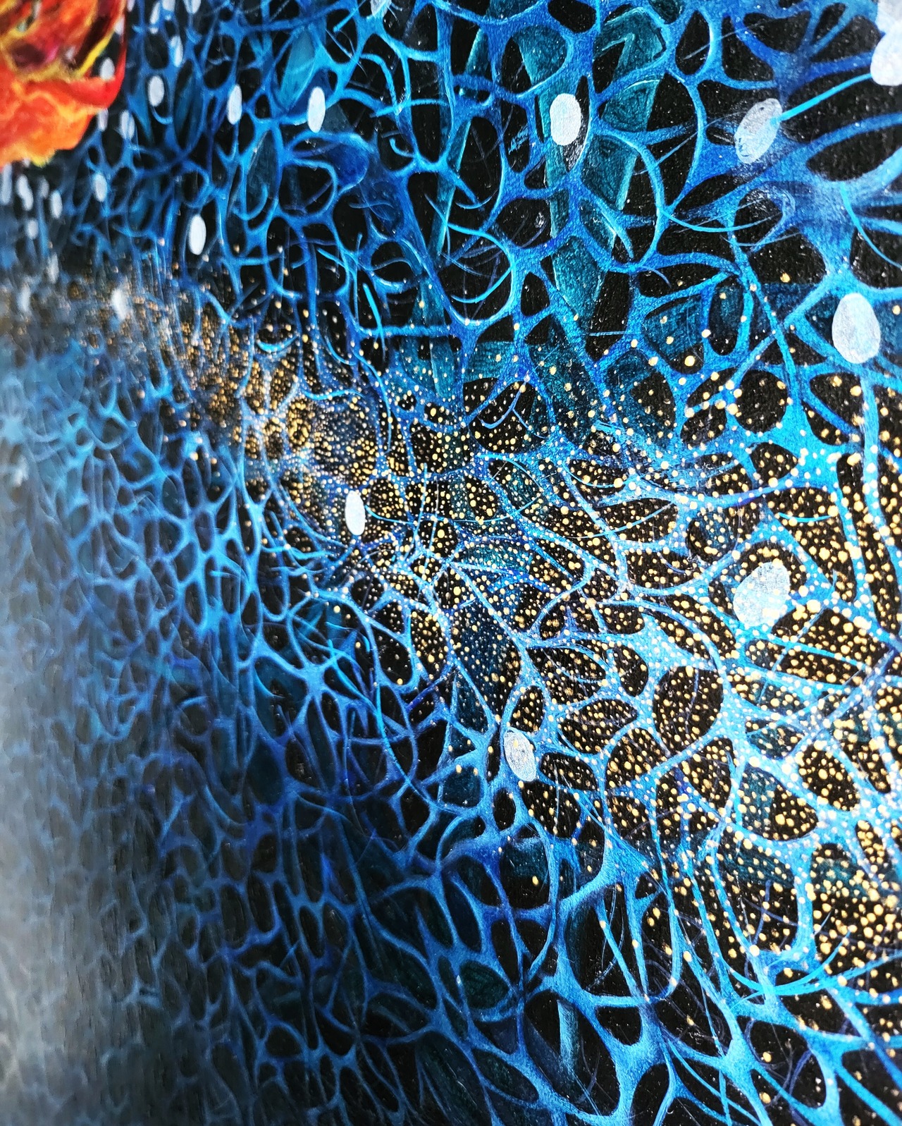 背景のブルーグラデーションは細胞と血流、金色斑点は花粉と命の流れていく様を現わしており、描くのには根気のいる箇所でした。