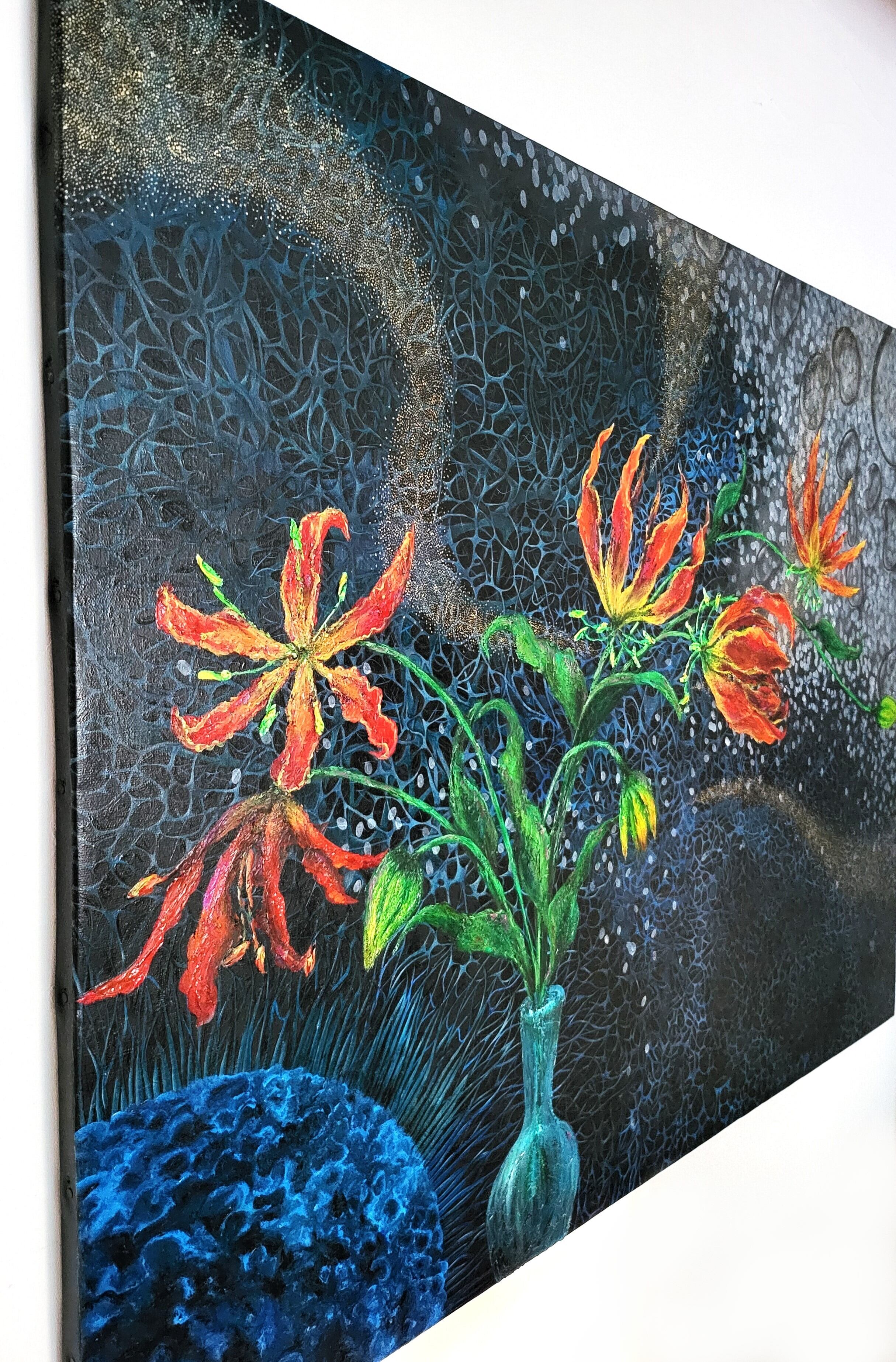 グロリオサはユリ科で球根に毒を持ち、雄しべと雌しべが花弁から上に飛び出す独特の形状をしております。それは受粉者(特に昆虫)を引き寄せるために進化したとのことで、まるで命が燃え上がっているかのような非常に美しいフォルムとその力強さを絵に残したく制作しました。
